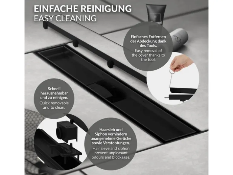 Hygienisch und pflegeleicht: Sauberkeit ist der Schlüssel zu einem gesunden Badezimmer. Unsere Duschrinne ist einfach zu reinigen, was Zeit und Aufwand spart.