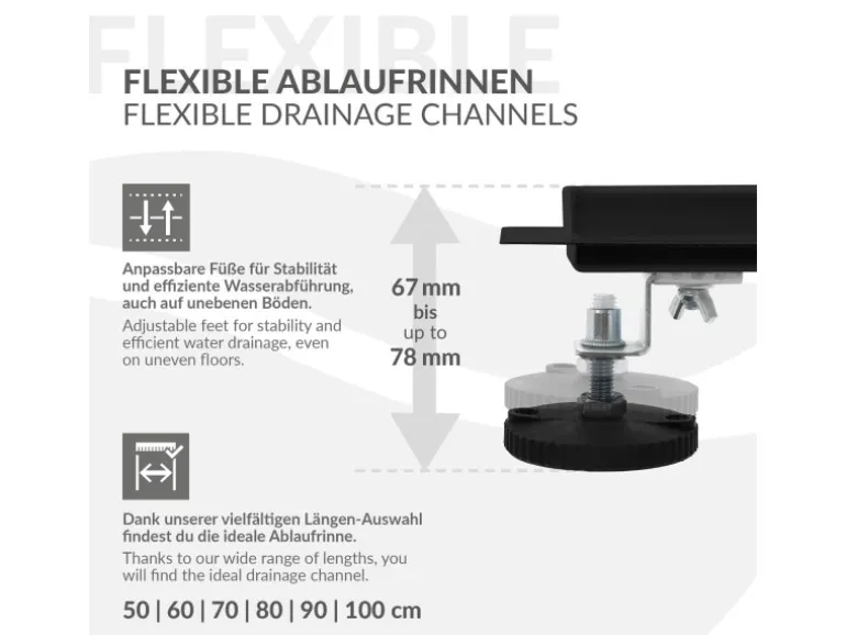 Individuelle Anpassung: Unsere Duschrinne ist mit höhenverstellbaren Stellfüßen ausgestattet, um sicherzustellen, dass sie perfekt zu deiner Dusche passt. Kein aufwändiges Ausmessen oder Anpassen mehr – Du hast die volle Kontrolle.