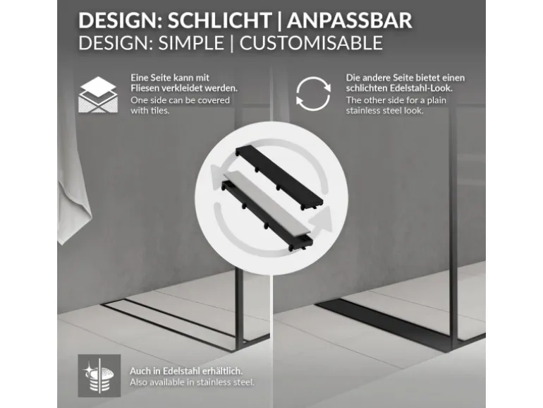 Ästhetisch anpassbar: Unsere Rinne kann befliesbar gestaltet werden, um nahtlos in dein Badezimmerdesign zu passen. Dein Bad wird zu einem Ort der Entspannung und Schönheit.