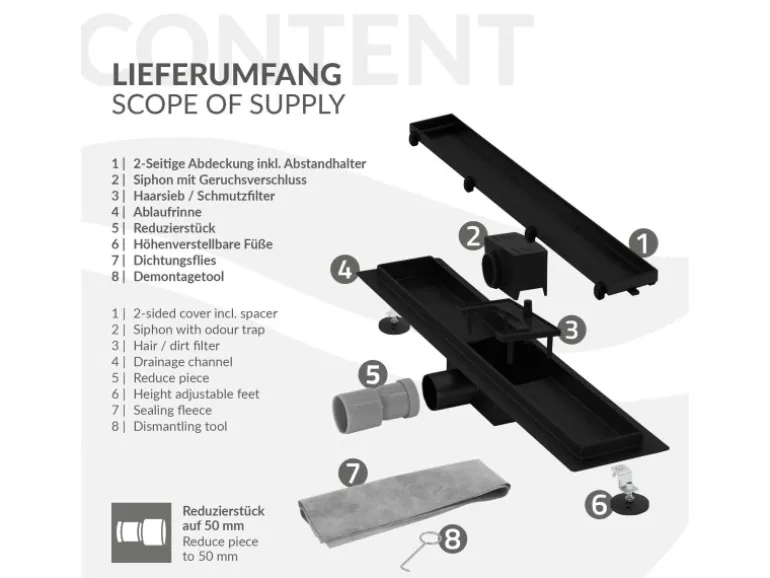 Individuelle Anpassung: Unsere Duschrinne ist mit höhenverstellbaren Stellfüßen ausgestattet, um sicherzustellen, dass sie perfekt zu deiner Dusche passt. Kein aufwändiges Ausmessen oder Anpassen mehr – Du hast die volle Kontrolle.