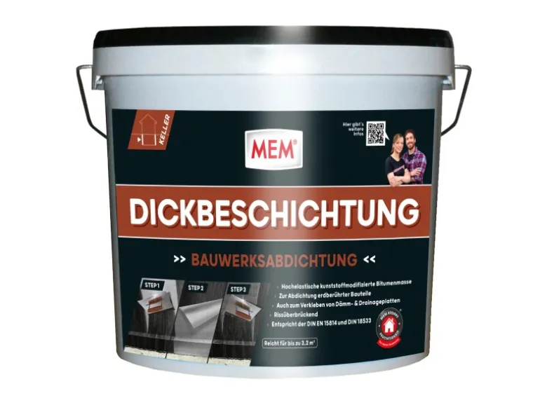 Die MEM Dickbeschichtung ist rissüberbrückend und frei von Lösemitteln. Sie bildet eine dauerhaft wasserdichte, tausalzbeständige und fäulnisfeste Sperrschicht gegen eindringendes Wasser. So sorgt es für einen langanhaltenden und beständigen Schutz Ihrer Kelleraußenwände und Fassaden.