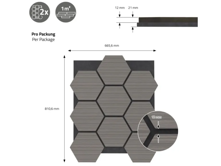 Du erhältst 9 Waben pro Paneel, die auf einem stabilen MDF-Träger mit schwarzem Filz befestigt sind. Dank der durchdachten Konstruktion kannst Du die Paneele senkrecht oder waagerecht anbringen – ganz so, wie es am besten zu deinem Raum passt. Ob geklebt oder verschraubt: Die Montage ist unkompliziert und die Platten lassen sich bei Bedarf leicht zuschneiden.