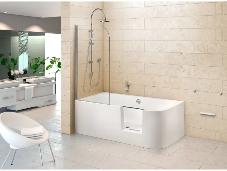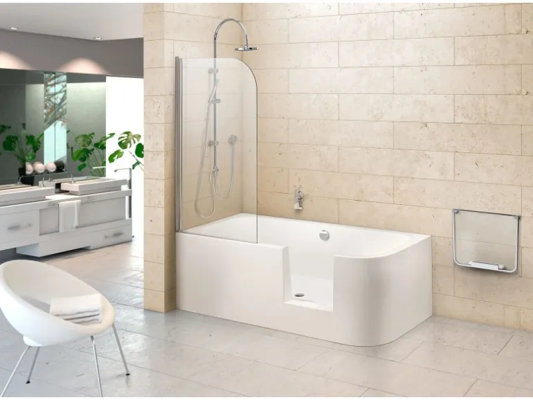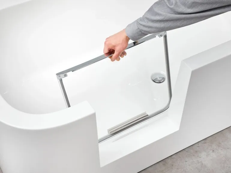 Die Tür kann zudem in der dafür vorgesehenen, magnetischen Wandhalterung sicher verwahrt werden (nicht im Lieferumfang enthalten). Des Weiteren lässt sich die Badewanne durch einen beidseitig schwenkbaren Echtglas-Wannenaufsatz (nicht im Lieferumfang enthalten) ganz einfach in eine Dusche umwandeln.