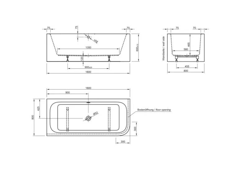 Die Einbau-Badewanne ist 80 cm breit und 180 cm lang, sodass Sie daher auch gut für kleinere Bäder geeignet ist. Die Stärke der an die Wand angrenzenden Wannenränder beträgt 75 mm, die anderen Wannenränder sind 70 mm breit (siehe Maßzeichnung). Die Badewanne wird inklusive verchromter Ab- und Überlaufgarnitur geliefert.