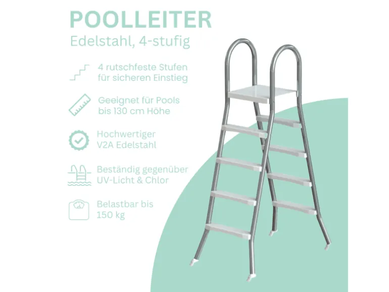 Die Edelstahlleiter bietet eine edle und formschöne Lösung für Pools mit einer Höhe von bis zu 1,40 m. Hergestellt aus hochklassigem Edelstahl (AISI 304), bietet diese Leiter eine hohe Langlebigkeit und Korrosionsbeständigkeit. Mit ihren 4 Stufen ermöglicht sie einen bequemen und sicheren Einstieg in Ihren Pool. Die elegante Edelstahloberfläche passt perfekt zu verschiedenen Poolstilen und verleiht Ihrem Schwimmbad eine ansprechende Optik. Die Montage der Poolleiter ist einfach und unkompliziert, mit allem erforderlichen Befestigungsmaterial für eine sichere Installation. Bitte beachten Sie, dass diese Leiter für Pools mit einer Höhe von bis zu 1,40 m geeignet ist.