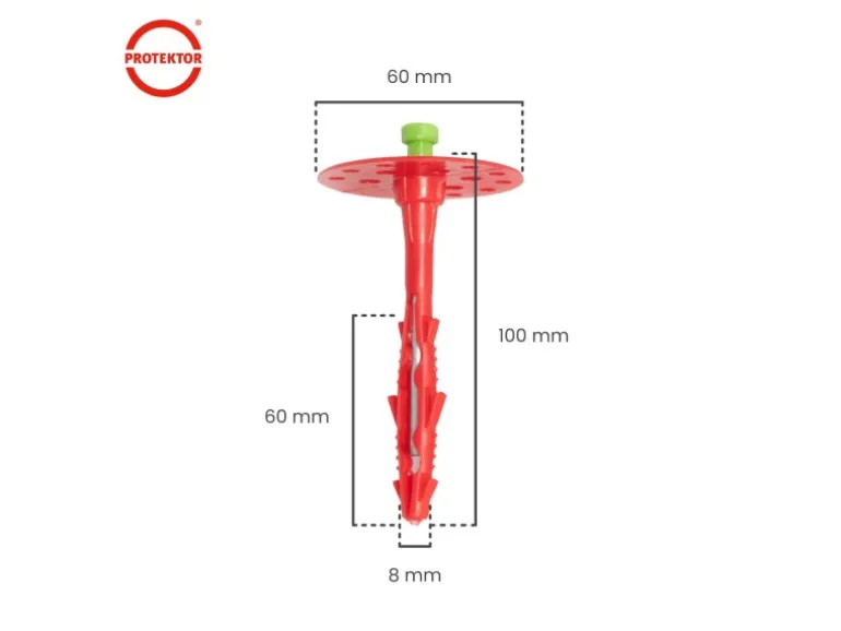 Sichere Dämmstoffbefestigung mit System Die Protektor Dämmstoffdübel in verschiedenen Längen für verschiedene Dämmschichtstärken verfügbar und 8mm Durchmesser wurden speziell für die zuverlässige Befestigung von Fassadendämmungen im WDVS entwickelt. Dank des Stahlnagels und des robusten PVC-Dübels ist eine schnelle, saubere und sichere Verarbeitung möglich – auch bei wechselnden Untergrundbedingungen.Optimale Anwendung im Außenbereich Geeignet für Beton, Naturstein, Vollstein, Gasbeton und Hohlblockstein, deckt dieser Dübel alle gängigen Baustoffklassen ab. Die Verankerungstiefe von 60mm sorgt für sicheren Halt selbst bei dicken Dämmschichten. Der 60mm große Dübelteller garantiert eine gleichmäßige Lastverteilung und festen Sitz in der Dämmplatte.Konstruiert für Profis Besondere Merkmale wie das Krallendesign, die spezielle Aufreiß-Technik sowie ein verstärkter Schaft sorgen für hohe Verankerungskraft und reduzierte Wärmebrücken. Eine verbesserte Kopfform mit breiter Schlagfläche erleichtert die Montage deutlich – ideal für den professionellen Dauereinsatz. Die Techniken sparen Zeit auf der Baustelle und erhöhen die Verarbeitungsqualität. Verschiedene Mengen und Längen – ideal für große Projekte im Bereich Fassadendämmung, Styroporplatten, Schallschutz oder Vollwärmeschutz.Für den professionellen Einsatz entwickelt Ob als Styropordübel, Isolierdübel oder fischer-kompatibler WDVS-Dübel – dieser Protektor Dämmstoffdübel erfüllt höchste Ansprüche. Ideal für Fachbetriebe, Handwerker und Bauprofis, die auf langlebige und sichere Befestigung setzen.