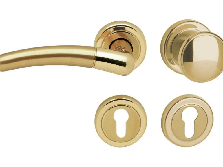Rosettengarnitur „Betty-R“ mit Profilzylinderlochung in Messing Poliert-Satiniert für Wohnungseingangstüren. Die Garnitur verfügt über eine Rückholfeder und garantiert somit einen dauerhaft waagrechten Sitz des Drückers. Die Garnitur ist passend für alle gängigen Türen mit einer Türstärke von 37 – 42 mm.