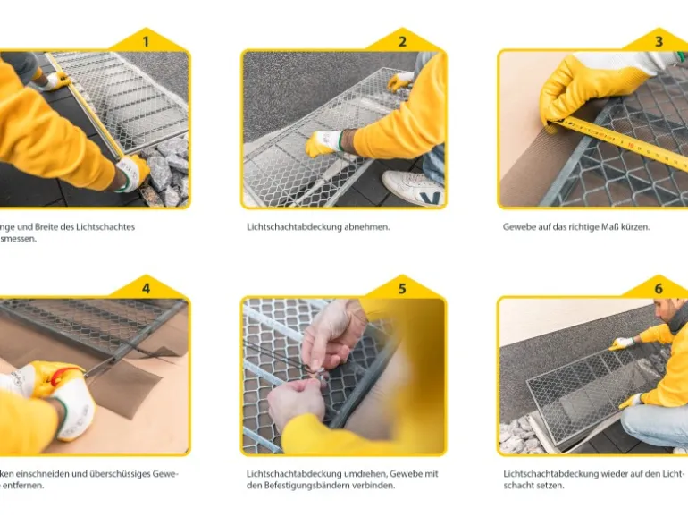 Die Montage dieser Lichtschacht-Abdeckung ist einfach und unkompliziert. Sie wird ohne einen zusätzlichen Rahmen direkt auf das vorhandene Licht- oder Kellerschachtgitter mit den maximalen Maßen von 50 x 125 cm gespannt. Die Abdeckung kann bei Bedarf individuell gekürzt werden und ist jederzeit abnehmbar. Das benötigte Befestigungsmaterial ist im Lieferumfang enthalten.
