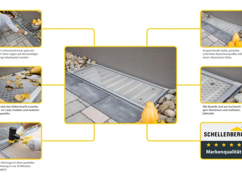 Die Montage ist einfach und kann schnell erledigt werden. Mit vier Schrauben und handelsüblichem Werkzeug wird die Abdeckung einfach am vorhandenen Licht- oder Kellerschachtgitter befestigt. Bei Bedarf kann sie jederzeit wieder demontiert werden. Die Größe der Abdeckung kann durch die Teleskop-Profile individuell an Ihre benötigten Maße angepasst werden, indem sie zusammengeschoben oder auseinandergezogen werden.