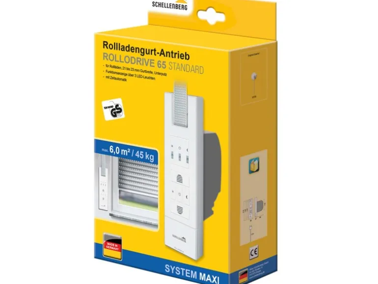Der Schellenberg RolloDrive 65 Standard ermöglicht die Bedienung eines Rollladens bequem per Knopfdruck oder Zeitautomatik. Der elektrische Gurtwickler ist für Kunststoff-Rollläden bis zu einer Fläche von 6 m² geeignet und kompatibel mit dem Rollladensystem Maxi mit einer Gurtbreite von 23 mm. Er ersetzt einen vorhandenen mechanischen Einlasswickler vollständig. Der RolloDrive 65 Standard kann in alle gängigen Mauerkästen mit einer Öffnungshöhe von mindestens 134 mm verbaut werden und hat Lochabstände von 165 bzw. 185 mm. Er ist ideal auch für Mietobjekte geeignet, da für den Einbau das Öffnen des Rollladenkastens nicht notwendig ist.