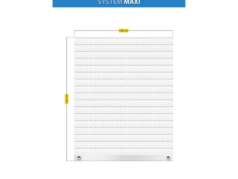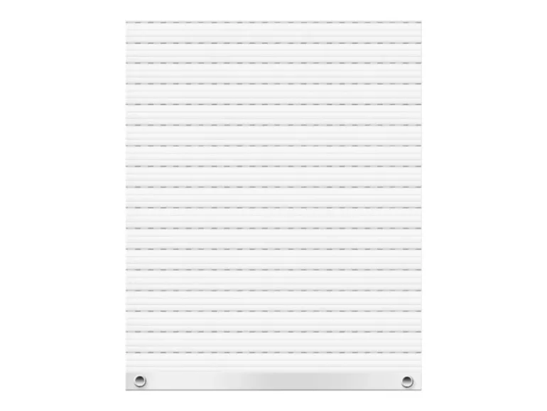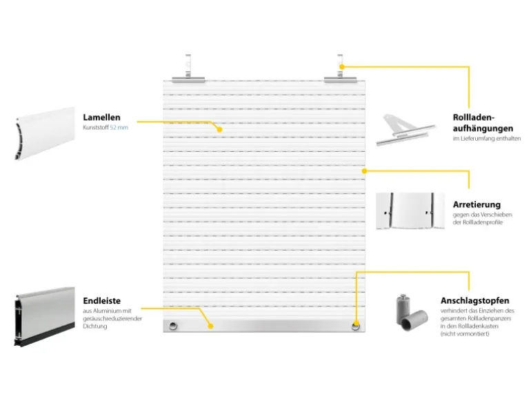 Die PVC-Lamellen des Rollladenpanzers sind leicht witterungsbeständig und haben ein stabiles Mehrkammer-System. Sie entsprechen dem Schellenberg Rollladensystem Mini, haben eine Deckhöhe von 52 mm und eine Tiefe von 14 mm. Die im Set enthaltene Abschlussleiste verfügt über einen integrierten Gummikeder, der für ein geräuscharmes Aufsetzen des Rollladens und zur Verhinderung von Festfrieren oder Beschädigungen an der Fensterbank sorgt.
