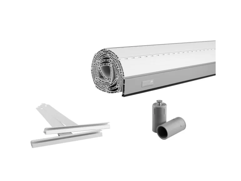 Dieses Set besteht aus einem grauen Rollladenpanzer aus PVC, Aufhängefedern, einer Endleiste aus Aluminium sowie passenden Rollladenstoppern.