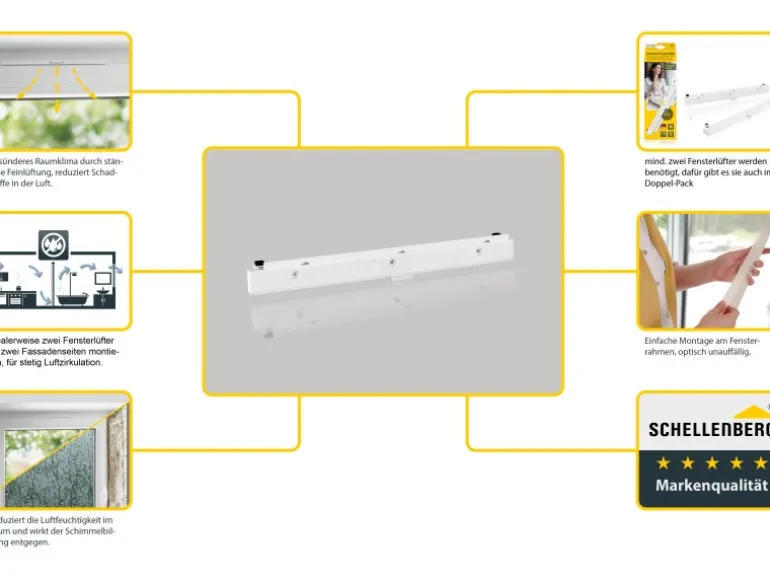 Die Universal-Fensterlüfter sind mit wenigen Handgriffen am Fensterflügel eines Kunststofffensters befestigt. Dafür muss ein Teil der Gummidichtung entfernt werden. Das für die Montage benötigte Zubehör ist im Lieferumfang enthalten. Die Universal-Fensterlüfter benötigen keinen Stromanschluss und werden rein mechanisch bedient. Sie sind von der Wirkungsweise vergleichbar mit kostenintensiveren Zu- oder Abluftsystemen.