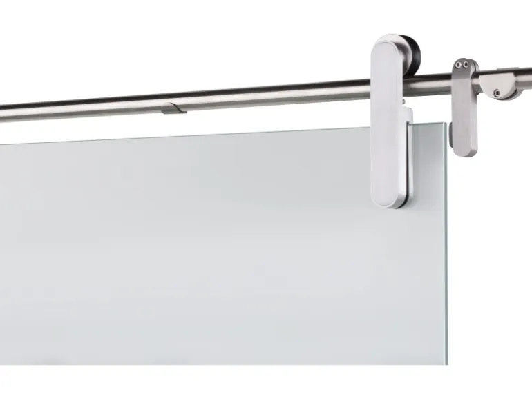Dieser edle Schienensatz ist für die Wandmontage von Glasschiebetüren in 8 mm geeignet. Beim Fineline- Beschlag wird ein Edelstahlrohr mit Hilfe von Wandhaltern an die Wand montiert. Das Glastürblatt läuft mit 2 Laufwagen zum Klemmen auf der Edelstahl-Schiene. Bei Montage an einer Trockenbauwand ist eine stabile Unterkonstruktion nötig. Eine beiliegende Bodenführung hält die Schiebetür in der Spur.