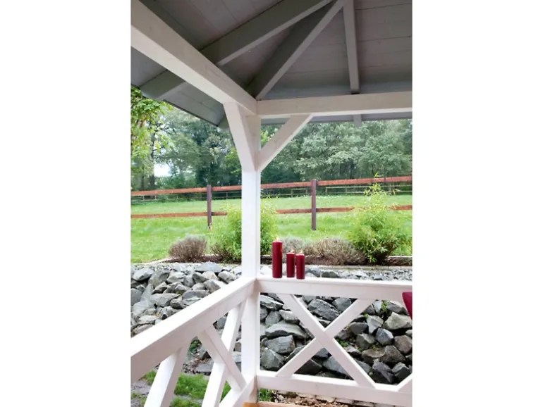 Eventuell abgebildete Terrassenüberdachungen, Farbbehandlung und Dekoration sind nicht im Lieferumfang enthalten. Hier handelt es sich um Kundenfotos, die Ihnen einen Eindruck im eingebauten Zustand vermitteln.