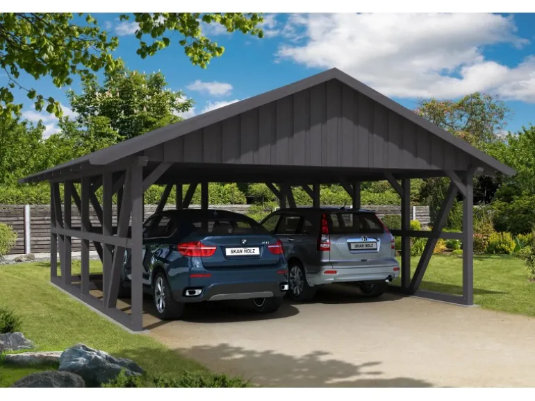 Ablagespuren bei farblich allseitig behandelten Bauteilen sind technisch bedingt. Das Dach wird mit 20 mm starker Dachschalung zur Eindeckung mit Dachschindeln geliefert (Dachschindeln sind als Zubehör optional bestellbar). Zur Verankerung mit der Bodenschwelle mit dem Untergrund sind Dübel im Bausatz enthalten.