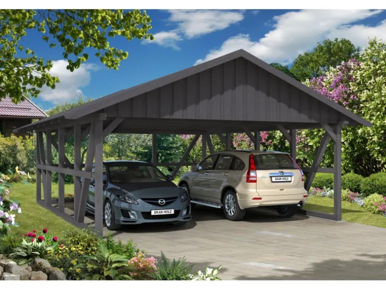 Ablagespuren bei farblich allseitig behandelten Bauteilen sind technisch bedingt. Das Dach wird mit 20 mm starker Dachschalung zur Eindeckung mit Dachschindeln geliefert (Dachschindeln sind als Zubehör optional bestellbar). Zur Verankerung mit der Bodenschwelle mit dem Untergrund sind Dübel im Bausatz enthalten.