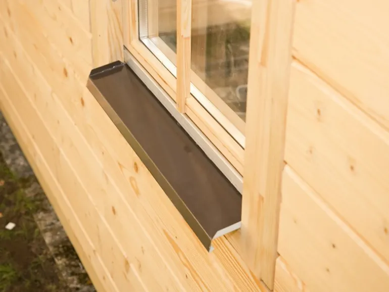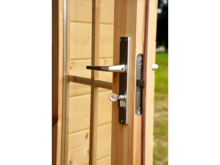 Außentür und Fenster mit Isolierglas und Gummidichtung sowie aufgesetztem Sprossenrahmen. Die Außentür ist aus Leimholz gefertigt und verfügt über ein Profilzylinderschloss mit 3 Schlüsseln. Die geschlossenen Innentüren verfügen über ein Buntbartschloss mit einem Schlüssel, Die Fenster sind mit einer Aluminium-Abtropfkante und einem Dreh-Kipp-Beschlag ausgestattet. Das Öffnungsmaß der Einzelfenster beträgt 68 x 78 cm, das der Doppelfenster 126,5 x 78 cm.