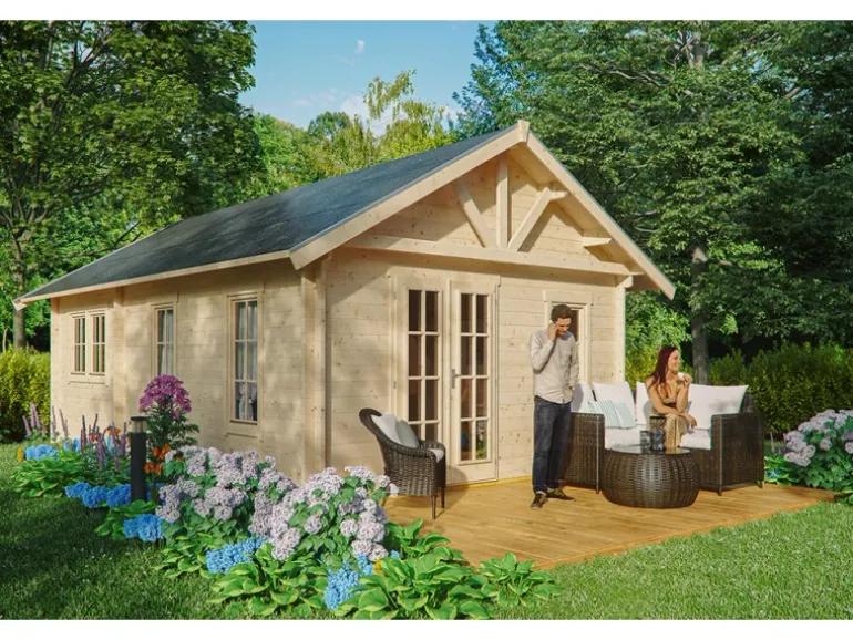Dach aus 19 mm Profilschalung mit Nut und Feder, Konterlattung und 2. Schalung aus 19 mm Profilholz für die Eindeckung mit Dachschindeln, inkl. 1 Lage Dachpappe. Aluminiumschienen als Giebelabschluss, Dachneigung 30 Grad. Für die Eindeckung mit Dachschindeln werden 25 Pakete á 2 m² benötigt, diese sind nicht im Lieferumfang enthalten.