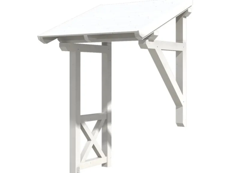 Die Konstruktion des Vordaches ist aus Konstruktionsvollholz (KVH) gefertigt. Als KVH bezeichnet man technisch getrocknetes, endlos verleimtes, massives Fichtenholz. Die einzelnen Holzteile werden getrocknet, nach Fehlern gescannt, sortiert und anschließend wetterfest durch Keilzinken miteinander endlos verleimt. Risse, Äste und leichte Verdrehungen spiegeln den Charakter der eingesetzten Materialien wider.