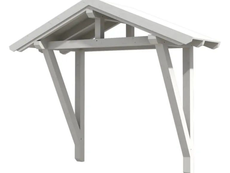 Die Konstruktion des Vordaches ist aus Konstruktionsvollholz (KVH) gefertigt. Als KVH bezeichnet man technisch getrocknetes, endlos verleimtes, massives Fichtenholz. Die einzelnen Holzteile werden getrocknet, nach Fehlern gescannt, sortiert und anschließend wetterfest durch Keilzinken miteinander endlos verleimt. Risse, Äste und leichte Verdrehungen spiegeln den Charakter der eingesetzten Materialien wider.