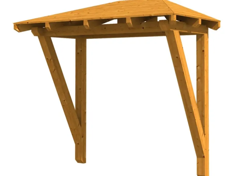 Die Konstruktion des Vordaches ist aus Konstruktionsvollholz (KVH) gefertigt. Als KVH bezeichnet man technisch getrocknetes, endlos verleimtes, massives Fichtenholz. Die einzelnen Holzteile werden getrocknet, nach Fehlern gescannt, sortiert und anschließend wetterfest durch Keilzinken miteinander endlos verleimt. Risse, Äste und leichte Verdrehungen spiegeln den Charakter der eingesetzten Materialien wider.