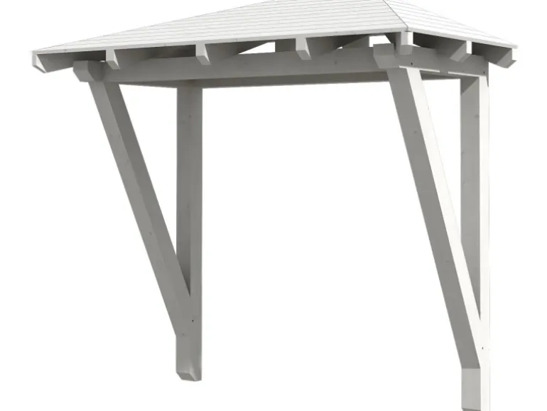 Die Konstruktion des Vordaches ist aus Konstruktionsvollholz (KVH) gefertigt. Als KVH bezeichnet man technisch getrocknetes, endlos verleimtes, massives Fichtenholz. Die einzelnen Holzteile werden getrocknet, nach Fehlern gescannt, sortiert und anschließend wetterfest durch Keilzinken miteinander endlos verleimt. Risse, Äste und leichte Verdrehungen spiegeln den Charakter der eingesetzten Materialien wider.