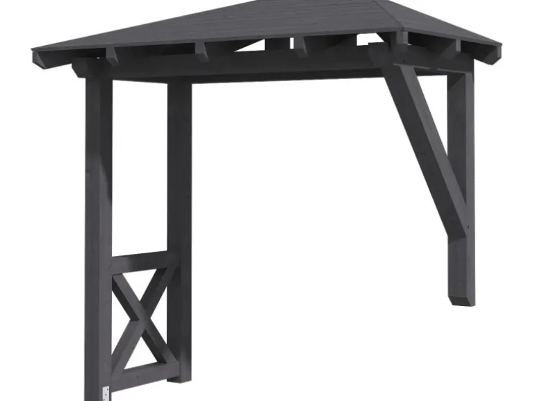 Die Konstruktion des Vordaches ist aus Konstruktionsvollholz (KVH) gefertigt. Als KVH bezeichnet man technisch getrocknetes, endlos verleimtes, massives Fichtenholz. Die einzelnen Holzteile werden getrocknet, nach Fehlern gescannt, sortiert und anschließend wetterfest durch Keilzinken miteinander endlos verleimt. Risse, Äste und leichte Verdrehungen spiegeln den Charakter der eingesetzten Materialien wider.