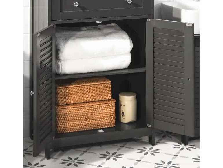 Großer Stauraum mit einer Schublade und 2 Türen mit Ablagefach.