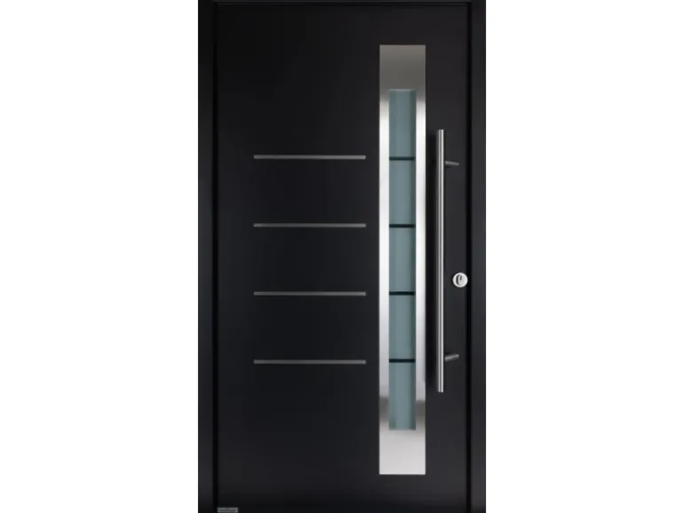 Die Hauseingangstür bietet optimale Wärmedämmung. Alle Bauelemente tragen dazu bei: Das Stahltürblatt mit einer Bautiefe von 67 mm ist mit PU-Hartschaum gefüllt und verfügt über zwei Dichtungsebenen. Die Türzarge und die Bodenschwelle aus thermisch getrenntem Aluminium verbessern die Wärmedämmung zusätzlich. Der Wärmedämmwert Ud beträgt 0,79 W/m² K. Die dreifache ISO-Verglasung reduziert den Wärmeverlust mit einem Ug-Wert von 0,9 W/m² K und lässt natürliches Licht effizient durch.