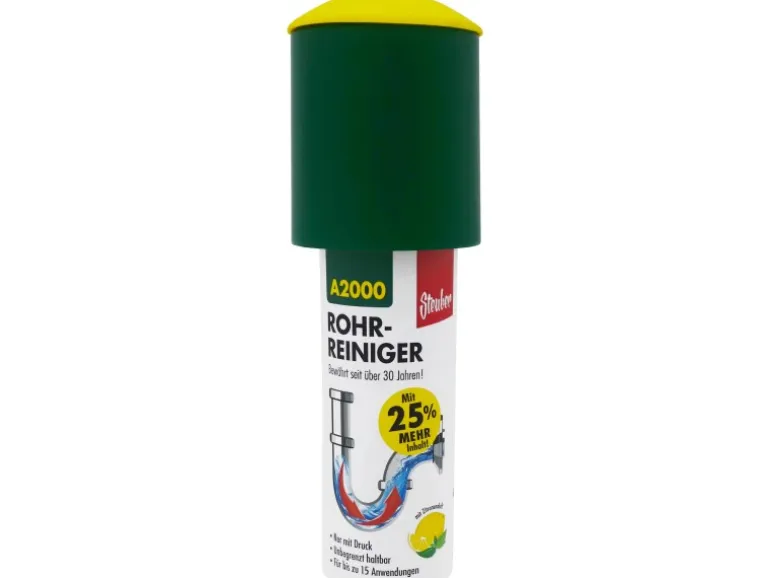 Der Steuber Rohrreiniger A2000 beseitigt Verstopfungen nur durch Druck und Kompression in wenigen Sekunden. Der A2000 bereinigt ohne ätzende Chemikalien alle Arten von Ablussrohren und ist bis zu 15 Anwendungen geeignet und bewährt sich seit über 30 Jahren.
