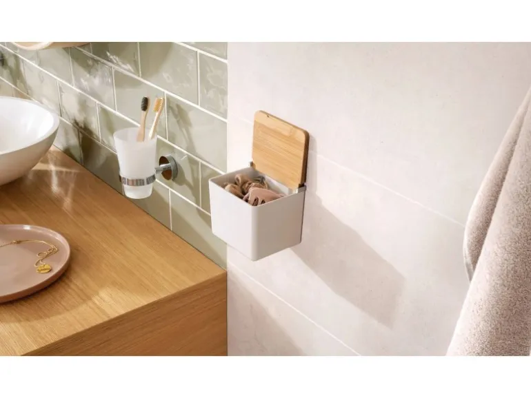 Bequeme und praktische Aufbewahrungslösung für das Badezimmer – einfache Befestigung mit Tesa Powerstrips Waterproof. Kein Bohren notwendig. Die Tesa Baboo Aufbewahrungsbox Small Weiß mit Deckelist perfekt, um Körperpflege- oder andere Badutensilien ordentlich und organisiert aufzubewahren. Der Behälter besteht aus hochwertigem weißem Kunststoff und hat einen Deckel aus Bambus – ein vielseitiger Look, der zu jedem Badezimmerstil passt. Die mitgelieferten Klebestreifen Tesa Powerstrips Waterpoof XL sorgen für eine wasserfeste Verklebung mit einer max. Haltekraft von 3 kg. Die Streifen lassen sich leicht und rückstandslos entfernen.