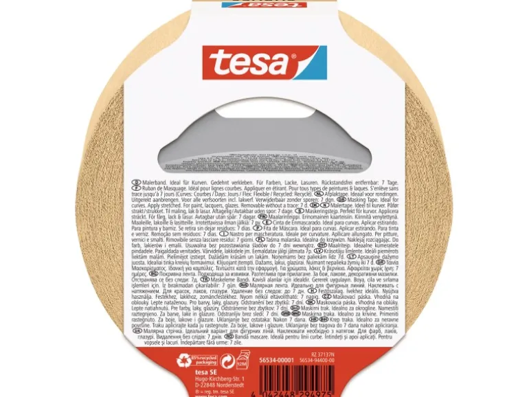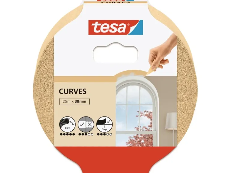 Das Tesa Maler-Krepp für Kurven lässt sich schnell und einfach anbringen und im Innenbereich innerhalb von sieben Tagen bequem und ohne Rückstände entfernen. Es ist für alle Farbtypen geeignet und ein kompetenter Helfer, wenn Sie unregelmäßige Formen abkleben möchten.