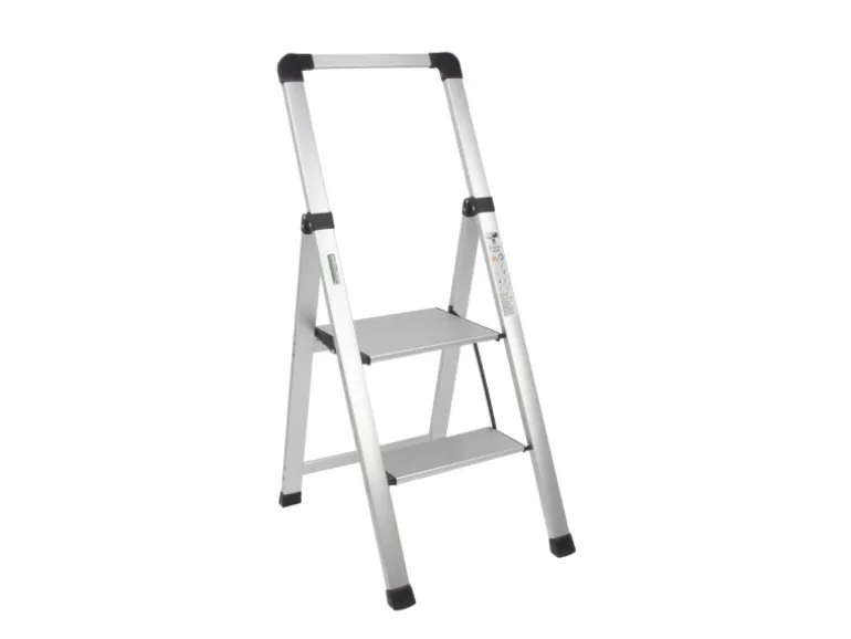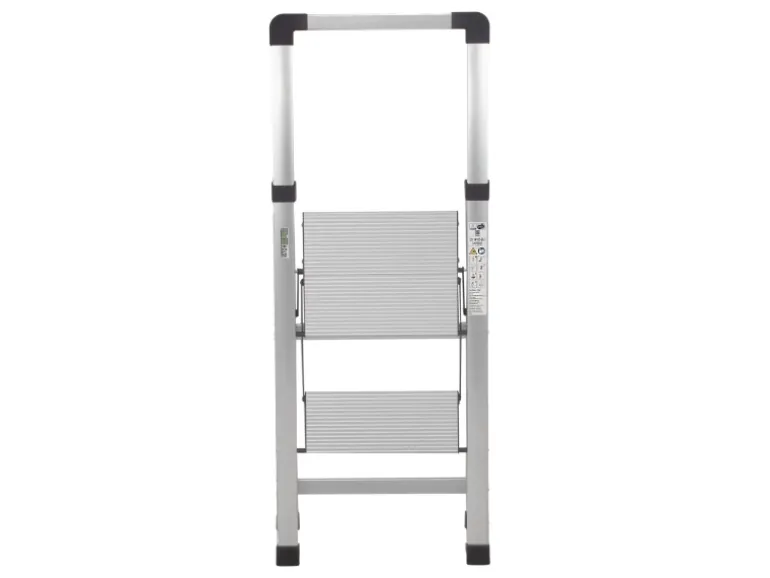 Der zweistufige Alu-Tritt ist TÜV/GS zertifiziert und bietet eine geprüfte Tragfähigkeit von bis 150 kg. Ein weiteres Element für die sichere Anwendung ist eine integrierte Sicherheitsverriegelung, die ein ungewolltes Zusammenklappen der Leiter verhindert. Zusätzlich unterstützen rutschfest profilierte Trittstufen ein sicheres Besteigen des Klapptritts, während gummierte Standfüße das Rutschen auf glatten Böden verhindern. Die Gummierung schützt gleichzeitig empfindliche Böden vor Kratzern. Nach Gebrauch lässt sich der Klapptritt im Handumdrehen zusammenfalten und mit nur ca. 5 cm Breite ist er so platzsparend, dass er hinter Türen, unter Möbel oder in schmale Nischen passt.