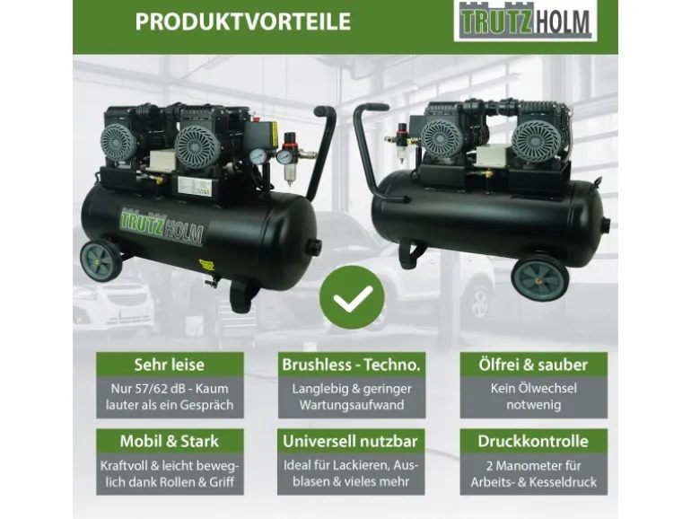 TRUTZHOLM Premium Brushless Silent Flüsterkompressor Der Premium Brushless Silent Flüsterkompressor 50L von TRUTZHOLM überzeugt durch leisen Betrieb, moderne Technik und solide Leistung. Mit einer Motorleistung von 1800 Watt, aufgeteilt auf zwei wartungsarme und ölfreie Brushless-Motoren, liefert der Kompressor eine konstante Druckluftversorgung bei gleichzeitig geringer Geräuschentwicklung. Mit nur 57-62 dB im Betrieb gehört er zu den leisesten seiner Klasse und ermöglicht ein entspanntes Arbeiten, ohne Nachbarn oder Kollegen unnötig zu stören. Der robuste, innenbeschichtete 50 Liter Tank bietet ausreichend Luftreserven, um typische Werkstatt- und Hobbyarbeiten zuverlässig zu erledigen. Ob Lackieren, Ausblasen, Schrauben, Hölzer imprägnieren oder kleinere Sandstrahlarbeiten – der Trutzholm Flüsterkompressor ist vielseitig einsetzbar und liefert zuverlässig bis zu 8 bar Druck. Dank automatischer Abschaltung bei 8 bar und Wiedereinschaltung bei 6 bar arbeitet das Gerät effizient und sicher. Zur Ausstattung gehören zwei gut ablesbare Manometer, die sowohl den Kessel- als auch den Arbeitsdruck anzeigen, sowie ein integrierter Druckminderer zur präzisen Regulierung. Eine Schnellkupplung erleichtert den Werkzeugwechsel, während Sicherheitsventil und Entwässerungsschraube zusätzliche Sicherheit und einfache Wartung bieten. Dank Rollen, praktischem Handgriff und vibrationsdämpfenden Standfüßen lässt sich der rund 39 Kilogramm schwere Kompressor trotz stabiler Bauweise bequem bewegen und sicher positionieren. Der ölfreie Betrieb macht ihn nahezu wartungsfrei, reduziert Verschleiß und sorgt für eine lange Lebensdauer. Ob für den ambitionierten Heimwerker oder den Einsatz in der Werkstatt – der Trutzholm Premium Brushless Silent Flüsterkompressor 50L kombiniert Laufruhe, Zuverlässigkeit und Flexibilität auf hohem Niveau. Jetzt den Premium Brushless Silent Flüsterkompressor sichern – flüsterleise, leistungsstark und sofort einsatzbereit! Eigenschaften: Flüsterkompressor mit geringer Geräuschentwicklung von 57dB (LpA) / 62dB Korrosionsschutz am innenbeschichteten Tank Der Kompressor arbeitet zuverlässig mit verschleißfreien Brushless-Motoren Somit deutlich leiser als übliche Kompressoren mit gleicher Leistung Zwei öl-freie, service-freie Motoren für einen geringen Wartungsaufwand Robuster und leistungsstarker Kompressor mit innenbeschichtetem 50 Liter Drucklufttank Mitgelieferte Rollen & Handgriff für einfaches Bewegen in der Werkstatt/Garage Viele Anwendungen bis 8 bar regulierbar mittels Druckminderer Zwei Manometer (1x Arbeitsdruck, 1x Kesseldruck) und Schnellkupplung für geregelten Arbeitsdruck Vibrationsdämpfende Standfüße sorgen für einen sicheren Stand Ein Sicherheitsventil sorgt für Anwendersicherheit Eine Entwässerungsschraube ermöglicht die komfortable Wartung Technische Daten: Abmessung (LxBxH): ca. 770 x 310 x 595 mm Netzanschluss: 220-240 V | 50 Hz Max. Motorleistung: 1800 W ( 2x900W ) / 2 PS Motordrehzahl: 1400 min^-1 Ansaugleistung: 290 L/min Abgabeleistung bei 6 bar: 120 L/min Max. Betriebsdruck: 8 bar Automatische Abschaltung bei 8 bar Wiedereinschaltung bei 6 bar Kesselinhalt: 50 Liter Zylinderzahl: 4 Stück Einschaltdruck: 6 bar Lärmpegel: 57 dBA / 62dB Gewicht: ca. 39 kg Lieferumfang: 1x TRUTZHOLM Flüsterkompressor TH-fk50l vormontiert 1x Bedienungsanleitung Info: Leichte Design- und Farbabweichungen möglich.