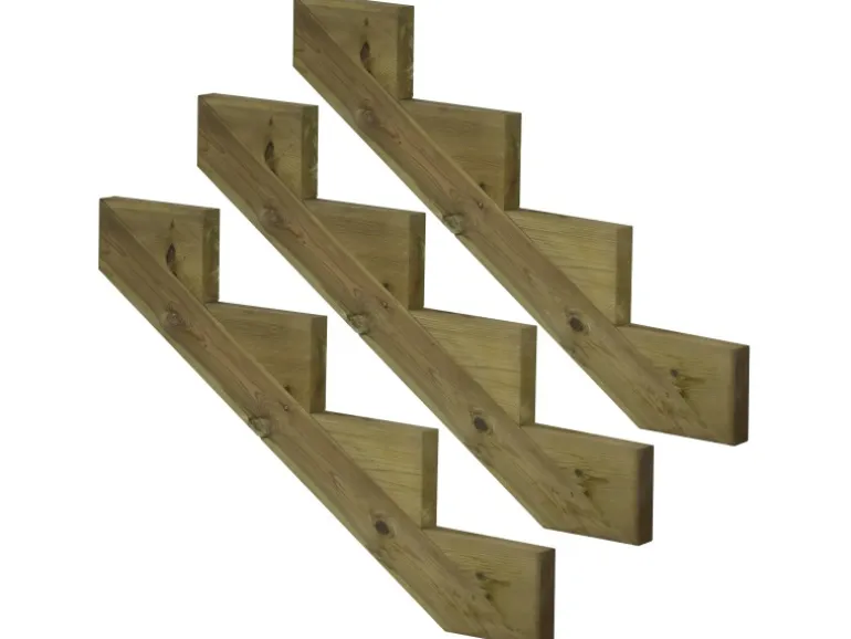 Dann verwenden Sie unsere praktischen Treppenwangen aus imprägniertem Holz (KDI)! Unsere Treppenwangen sind mit 2, 3, 4, 5, 6, 7 oder 8 Stufen erhältlich und die benötigte Anzahl hängt von der Breite Ihrer Treppe ab. Legen Sie die Treppenwangen im Abstand von max. 60 cm hin und schrauben Sie die Holzstufenbretter darauf. Für zusätzliche Stabilität und Sicherheit können Sie auch eine Setzstufe hinter jeder Stufe anbringen, indem Sie ein Holzbrett vertikal gegen die Treppenwange schrauben. Für die Treppenstufen empfehlen wir unsere KDI Terrassenbretten.