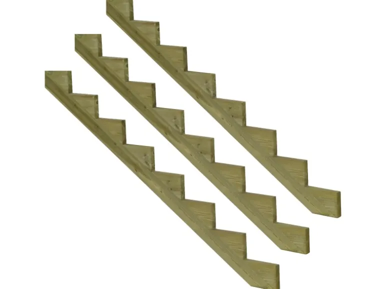 Dann verwenden Sie unsere praktischen Treppenwangen aus imprägniertem Holz (KDI)! Unsere Treppenwangen sind mit 2, 3, 4, 5, 6, 7 oder 8 Stufen erhältlich und die benötigte Anzahl hängt von der Breite Ihrer Treppe ab. Legen Sie die Treppenwangen im Abstand von max. 60 cm hin und schrauben Sie die Holzstufenbretter darauf. Für zusätzliche Stabilität und Sicherheit können Sie auch eine Setzstufe hinter jeder Stufe anbringen, indem Sie ein Holzbrett vertikal gegen die Treppenwange schrauben. Für die Treppenstufen empfehlen wir unsere KDI Terrassenbretten.