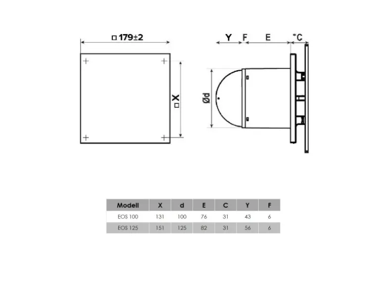Technische Daten: Geräuscharmer Kugellagermotor, 220 – 240 V / 50 Hz, Ø100 mm, 8,4 W, 100 m³/h, 25 dB(A) / 3m, IP45.