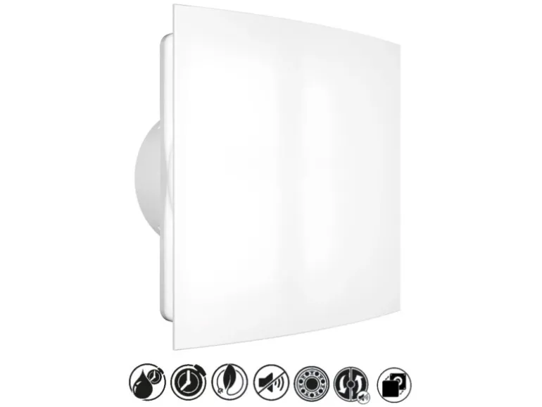 Technische Daten: Einstellbare Feuchtesteuerung (von 0 bis 90% relative Feuchtigkeit), einstellbare Nachlauffunktion (von 0 bis 30 Min), geräuscharmer Kugellagermotor, 220 – 240 V / 50 Hz, Ø100 mm, 8,0 W, 90 m³/h, 25 dB(A) / 3m, IP24.