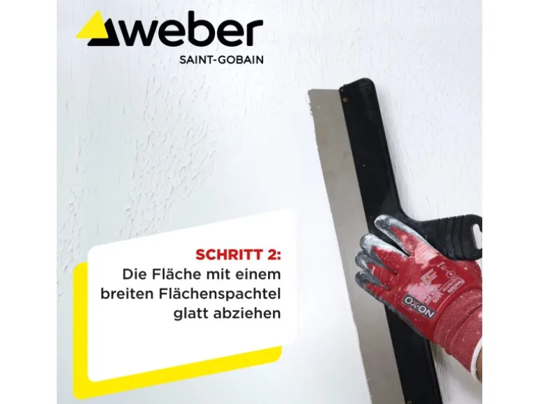 Der Untergrund muss tragfähig, trocken und eben sein. Schmutz, Staub und lose Teile müssen vom Untergrund entfernt werden. Für den jeweiligen Haftverbund am Untergrund empfehlen wir den Weber Universal Tiefgrund LF oder die Weber Haftgrundierung Putzgrund. Der Weber Rollspachtel Malerfinish to go füllt beim Verarbeiten mit der Rolle leichte Unebenheiten im Untergrund. Größere Vertiefungen und Gipskartonfugen müssen im Vorfeld glatt verspachtelt werden.