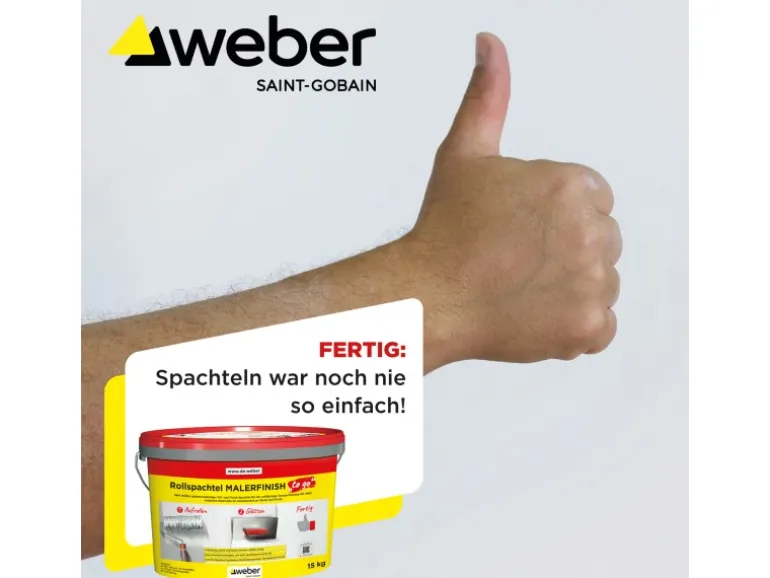 Aufrollen, glätten, fertig: Der Weber Rollspachtel Malerfinish to go ist vor der Verarbeitung kurz aufzurühren. Danach kann dieser sofort auf die gewünschte Arbeitsfläche mit einer handelsüblichen mittel- oder hochflorigen Malerrolle aufgetragen werden. Ein vorheriges leichtes Anfeuchten der Malerrolle erleichtert die Aufnahme der Spachtelmasse. Ein händischer Auftrag mit einem Spachtel ist ebenfalls möglich. Anschließend wird dieser mit einem Flächenspachtel glatt abgezogen. In schwierig zu erreichenden Eckbereichen empfehlen wir den Rollspachtel mit einem Flachpinsel aufzutragen. Größere Flächen sind in einzelnen Abschnitten zu bearbeiten. Die Trocknungszeit ist abhängig von den Temperaturen am Baukörper. Der Rollspachtel kann auf allen mineralischen Untergründen und Gipskartonplatten verarbeitet werden. Die Auftragsstärke je Arbeitsgang beträgt bis zu 3 mm.