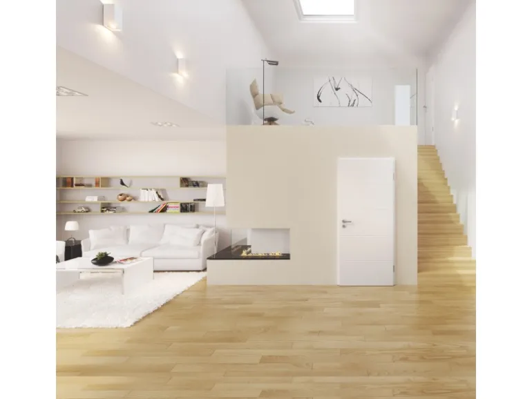 Die Tür aus der Serie Straight Line 5505 wird durch eine weiße Dekorfolie geschützt. Das Optische Highlight sind die vier horizontal verlaufenden Dekorlinien, die der Innentür einen zeitlosen Stil verleihen. Der Kern des Türblatts besteht aus einer leichten und stabilen Röhrenspaneinlage, die im Innern eine Spanplatte verarbeitet hat, welche mit röhrenförmigen Bohrungen versehen ist. Dies ermöglicht ein komfortables Öffnen und Schließen und ist für die vielseitige Verwendung im Wohnbereich geeignet. Das Türblatt mit eckiger Kantenform, liegt mit einem Überschlagpfalz auf der Zarge auf, deshalb ist hierbei auf die passende Zarge zu achten.