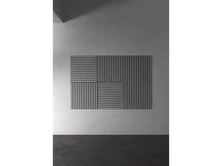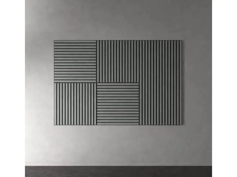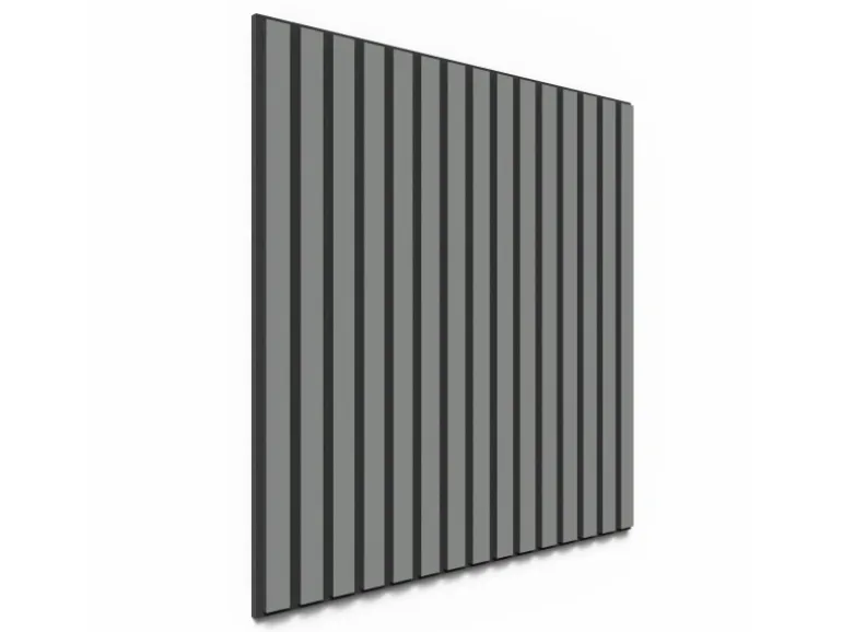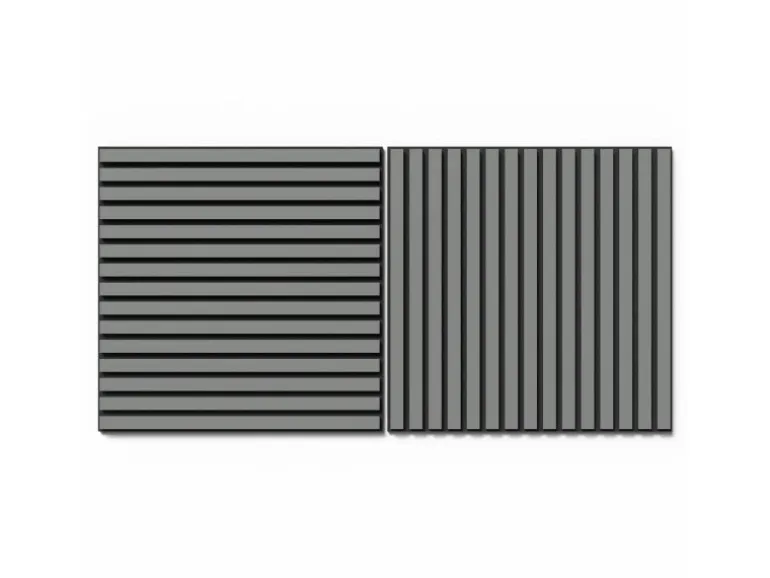 Die Akustikplatten lassen den Raum dank ihrer Streifenoptik tiefer und größer wirken. Kombinieren Sie verschiedene Formen und Proportionen von Akustikpaneelen, um einzigartige Muster und Designs an Wänden und Decken zu schaffen. Die Oberflächen in Linoleum unterstützen den skandinavischen Stil des Panels.