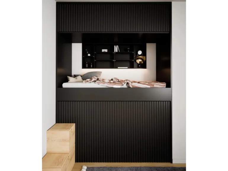 Die Akustikplatten lassen den Raum dank ihrer Streifenoptik tiefer und größer wirken. Kombinieren Sie verschiedene Formen und Proportionen von Akustikpaneelen, um einzigartige Muster und Designs an Wänden und Decken zu schaffen. Die Oberflächen in Linoleum unterstützen den skandinavischen Stil des Panels.