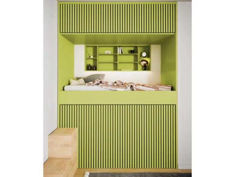 Die Akustikplatten lassen den Raum dank ihrer Streifenoptik tiefer und größer wirken. Kombinieren Sie verschiedene Formen und Proportionen von Akustikpaneelen, um einzigartige Muster und Designs an Wänden und Decken zu schaffen. Die Oberflächen in Linoleum unterstützen den skandinavischen Stil des Panels.