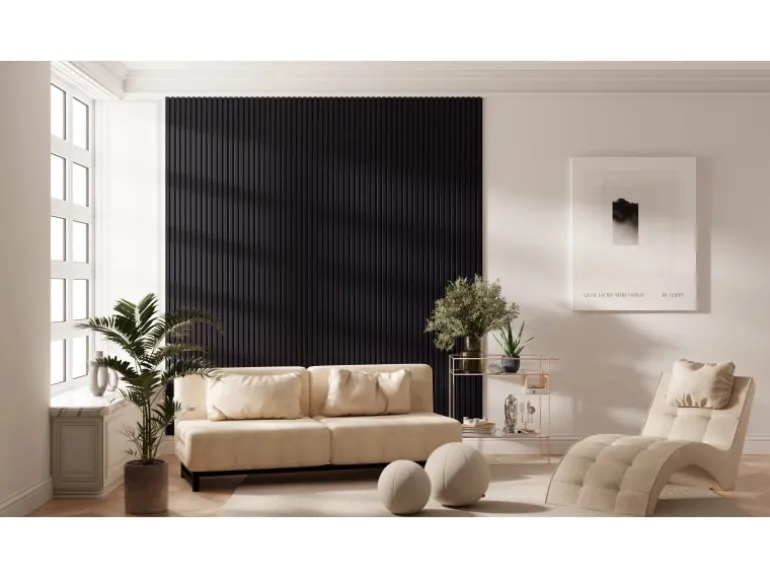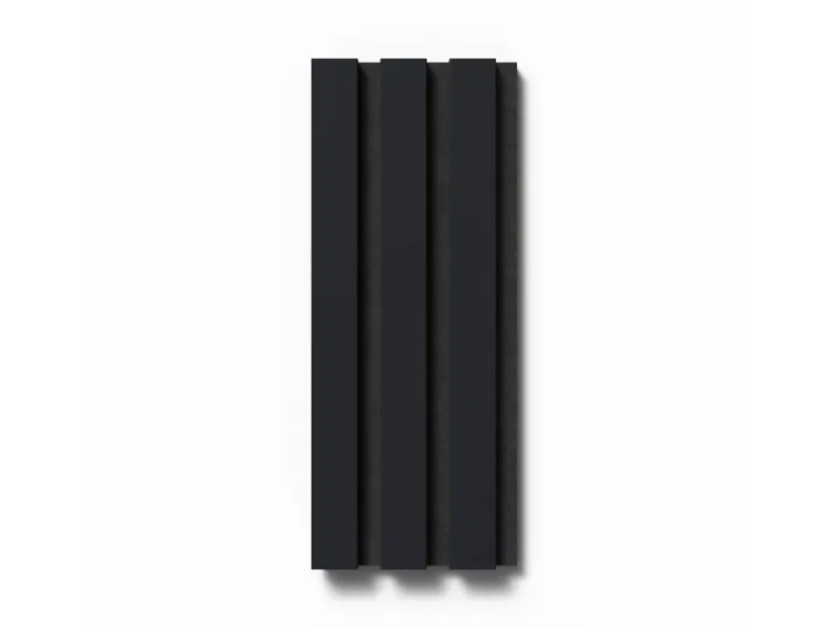 Die Akustikplatten lassen den Raum dank ihrer Streifenoptik tiefer und größer wirken. Kombinieren Sie verschiedene Formen und Proportionen von Akustikpaneelen, um einzigartige Muster und Designs an Wänden und Decken zu schaffen. Die Oberflächen in Folie unterstützen den skandinavischen Stil des Panels.