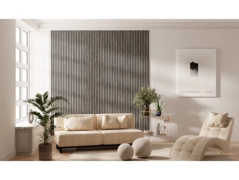 Die Akustikplatten lassen den Raum mit ihrem Streifenmuster tiefer und größer wirken. Kombinieren Sie verschiedene Formen und Proportionen der Akustikpaneele, um einzigartige Muster und Designs an Wänden und Decken zu schaffen. Die Oberflächen in Laminat unterstützen den skandinavischen Stil der Paneele.