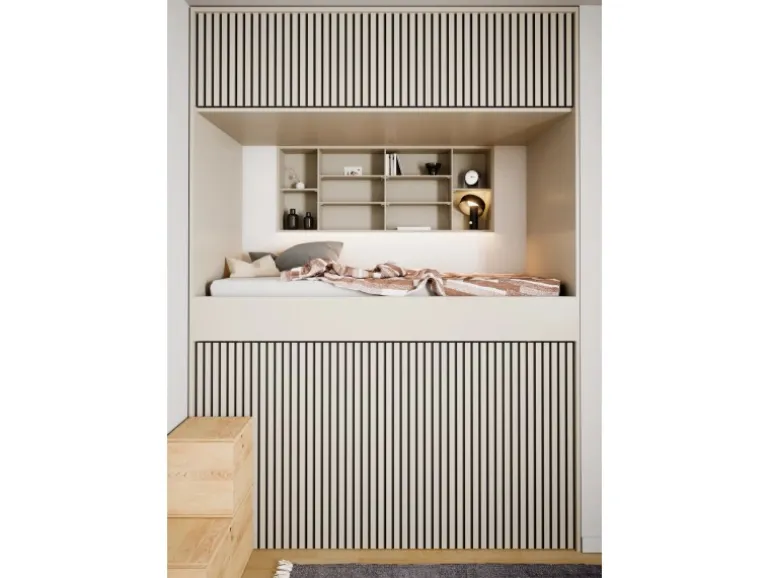 Die Akustikplatten lassen den Raum dank ihrer Streifenoptik tiefer und größer wirken. Kombinieren Sie verschiedene Formen und Proportionen von Akustikpaneelen, um einzigartige Muster und Designs an Wänden und Decken zu schaffen. Die Oberflächen in Linoleum unterstützen den skandinavischen Stil des Panels.