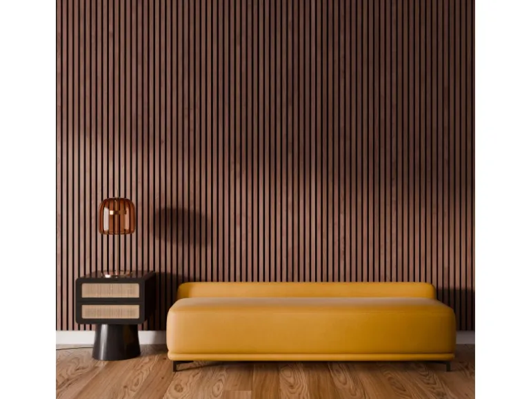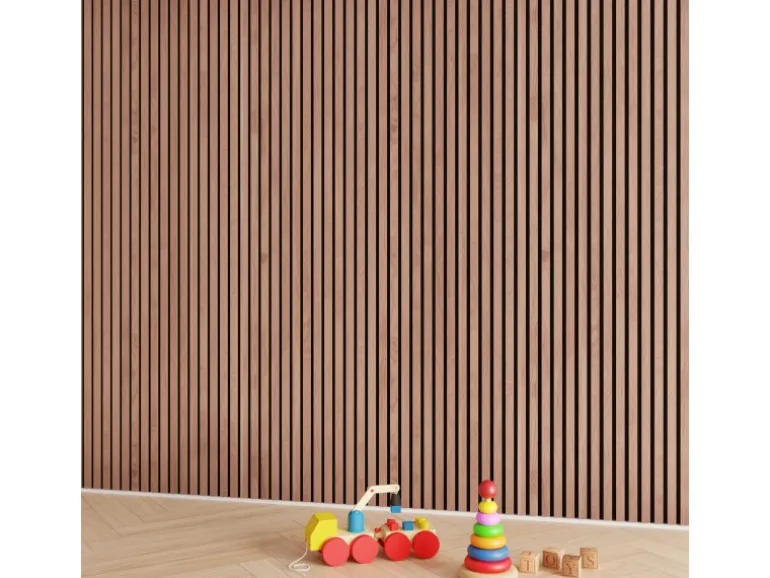 Die Akustikplatten lassen den Raum dank der Streifenoptik tiefer und größer wirken. Kombinieren Sie verschiedene Formen und Proportionen verschiedener Akustikpaneele und kreieren einzigartige Muster und Designs an Wänden und Decken. Die Oberflächen aus echtem Holzfurnier unterstützen den skandinavischen Stil des Panels. Zudem ist das Holz chemisch unbehandelt.
