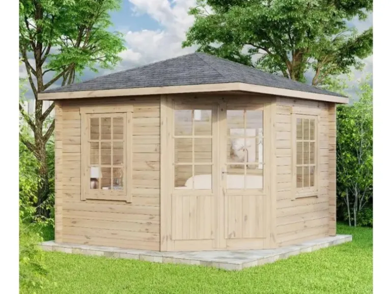 5-eckiges Gartenhaus aus unbehandeltem Massivholz in klassischem Design